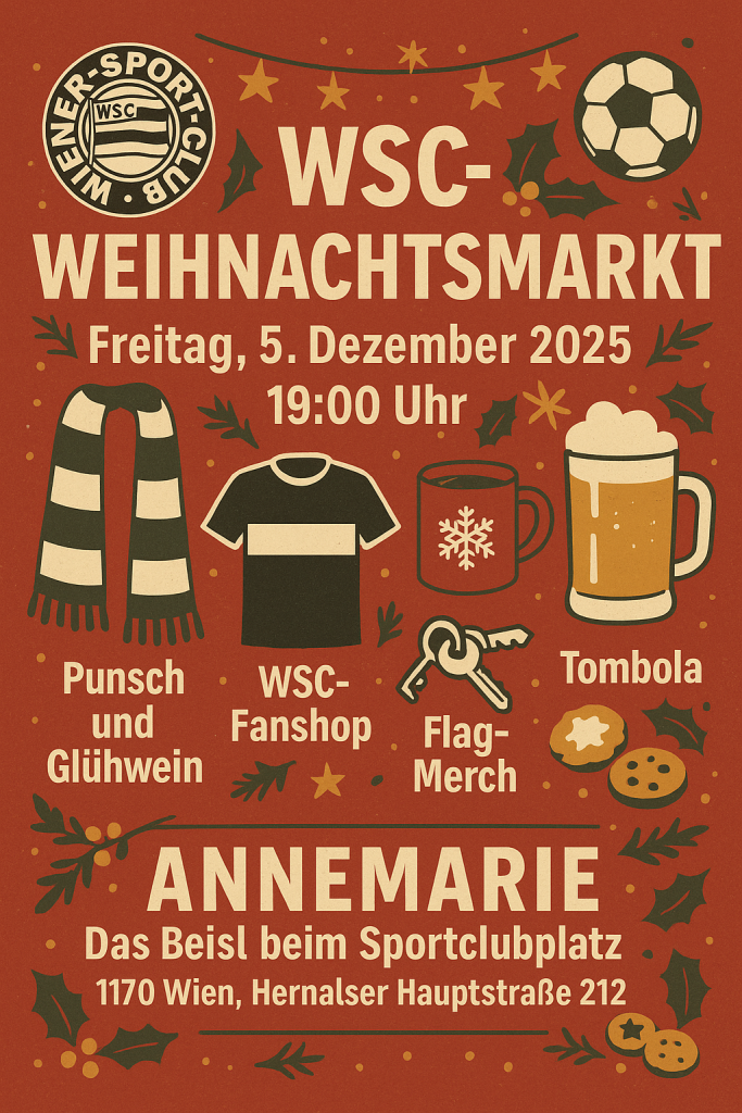 Am Freitag, dem 5. Dezember, gibts bei uns im Kellerstüberl wieder einen WSC-Weihnachtsmarkt! Ab 19 Uhr könnt ihr nicht nur schwarz-weiße Trikots, Schals, Shirts und Hoodies kaufen, sondern auch Punsch und Glühwein, belegte Brote und feine Kekserln genießen. Sehr gutes Bier gibts natürlich auch! Bitte kommt zahlreich und macht auch bei unserer Tombola […]