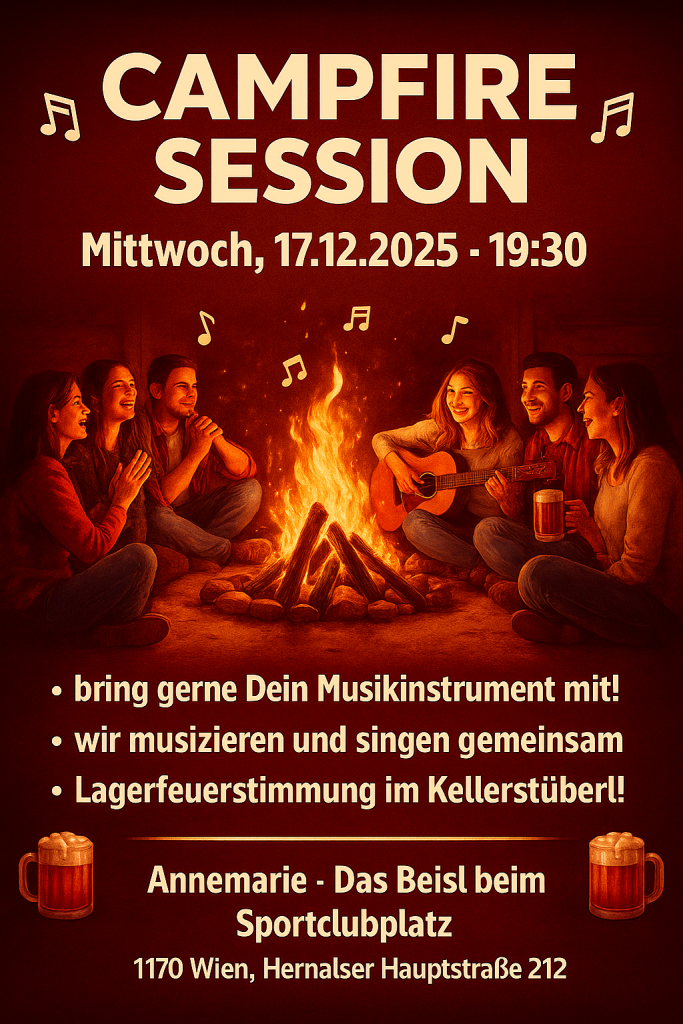 Komm ins Annemarie-Kellerstüberl und verbringe mit uns einen feinen Liederabend! Du kannst gerne Dein Musikinstrument mitbringen oder einfach nur mitsingen. Wir freuen uns auf Dich!